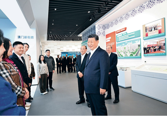 2024年12月19日上午,中共中央总书记、国家主席、中央军委主席习近平在澳门特别行政区行政长官贺一诚陪同下,来到横琴粤澳深度合作区考察。这是习近平在横琴天沐琴台展示厅澳门新街坊项目展区前,同居住在这里的市民代表亲切交谈。 新华社记者 燕雁 摄
