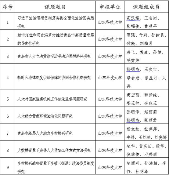 为深入扎实地做好人大制度和人大工作的理论研究,进一步提升研究成果的层次和质量,根据前期我校各课题小组提报的2021年度研究课题题目,已经理事长第16次办公会研究通过(名单如下),请根据研究课题认真开展调查研究,精心撰写研究报告,请各单位汇总课题研究成果报告电子版于2021年12月22日前发至人文社科处邮箱rwskc@sdust.edu.cn。