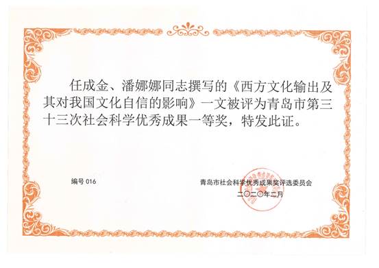 立项以来在《马克思主义研究》《内蒙古社会科学》《浙江师范大学学报》等期刊发表论文多篇,其中在《马克思主义研究》2018年第2期刊发论文《西方文化输出及其对我国文化自信的影响》,该文章引用18次,下载2000余次,被中国社会科学网等网站转载,荣获青岛市第33次社会科学优秀成果一等奖,山东省高校人文社科优秀成果二等奖等。
